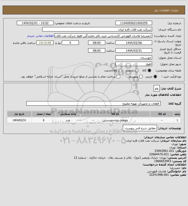 | 1 | -- | ولوهای ویژه مهندسی | عدد | 8 | 1404/02/31 |