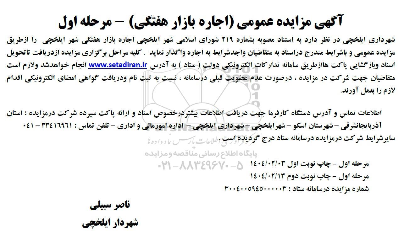 شهرداری ایلخچی در نظر دارد به استناد مصوبه شماره 219  شورای اسلامی ایلخچی اجاره بازار هفتگی شهر ایلخچی را از طریق مزایده عمومی و با شرایط مندرج در اسناد به متقاضیان واجد شرایط به اجاره واگذار نماید. کلیه مراحل برگزاری مزایده از دریافت و تحویل اسناد فراخوان تا بازگشایی پاکتها از طریق درگاه سامانه تدارکات الکترونیکی دولت ستاد به آدرس ستاد ایران انجام خواهد شد متقاضیان شرکت در فراخوان در صورت عدم عضویت درسامانه نسبت به ثبت نام و دریافت گواهی امضای الکترونیکی (به صورت برخط) برای کلیه صاحبان امضای مجاز و مهر سازمانی اقدام لازم را به عمل آورند