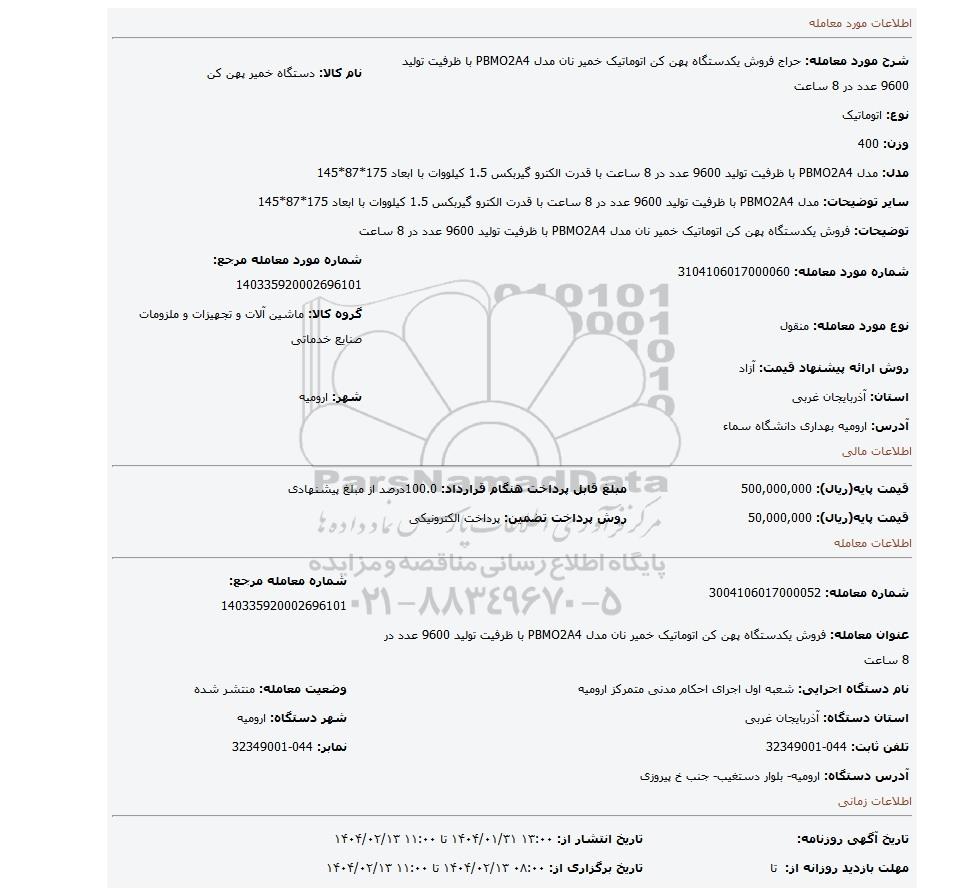 مزایده فروش یکدستگاه پهن کن اتوماتیک خمیر نان مدل PBMO2A4 با ظرفیت تولید 9600 عدد در 8 ساعت, مزایده، فروش یکدستگاه پهن کن اتوماتیک خمیر نان مدل PBMO2A4 با ظرفیت تولید 9600 عدد در 8 ساعت