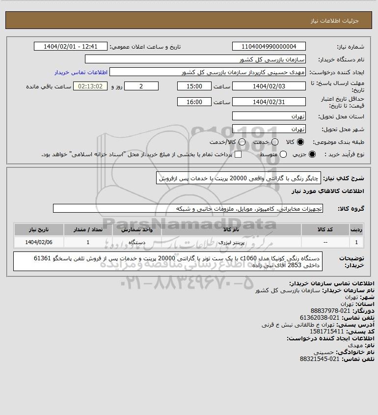 شرح کلی نیاز: چاپگر رنگی با گارانتی واقعی 20000 پرینت با خدمات پس ازفروش