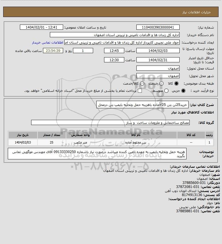 شرح کلی نیاز: خرید25تن بتن c25آماده باهزینه حمل وتخلیه باپمپ بتن درمحل