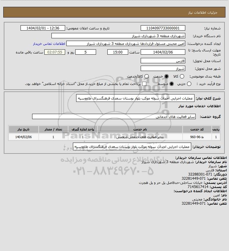 شرح کلی نیاز: عملیات اجرایی احداث سوله موکب بلوار بوستان سعدی فرهنگسرای طاووسیه