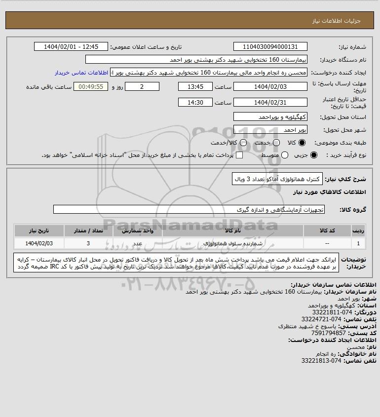 استعلام کنترل هماتولوژی آماکو تعداد 3 ویال, استعلام کنترل هماتولوژی آماکو تعداد 3 ویال
