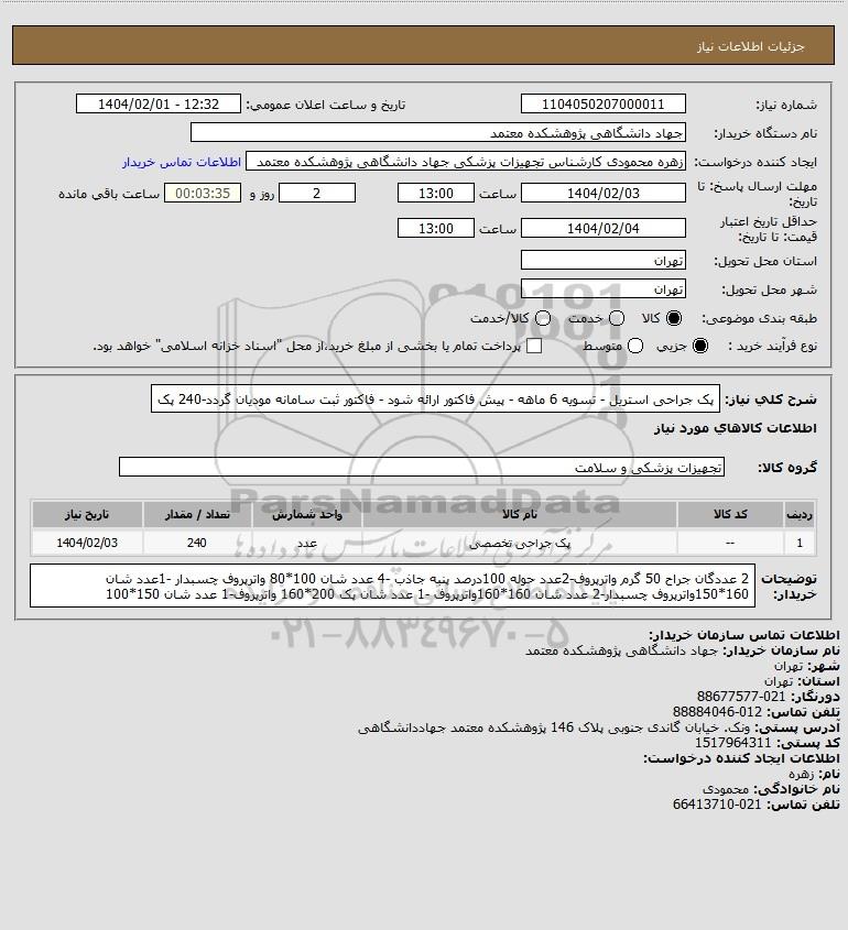 شرح کلی نیاز: پک جراحی استریل - تسویه 6 ماهه - پیش فاکتور ارائه شود - فاکتور ثبت سامانه مودیان گردد-240 پک