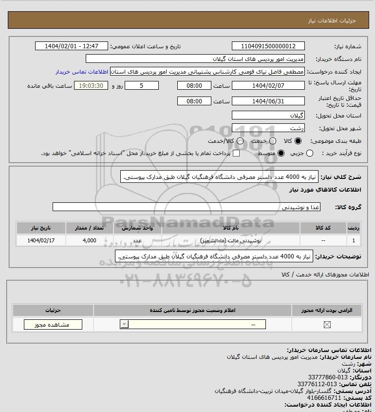 توضیحات خریدار:نیاز به 4000 عدد دلستر مصرفی دانشگاه فرهنگیان گیلان طبق مدارک پیوستی.