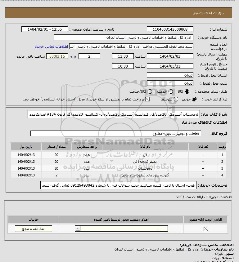 شرح کلی نیاز: ترموستات آبسردکن 20عدد/فن کندانسور آبسردکن20عدد/پروانه کندانسور 20عدد/گاز فریون A134 تعداد2عدد