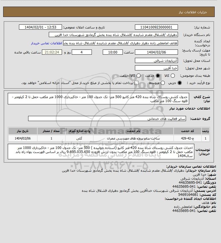 توضیحات خریدار: احداث جدول کشی روستای شاه بنده 420 متر کانیو (استاده خوابیده ) 500 متر- تک جدول 100 متر - خاکبرداری 1000 متر مکعب حمل تا 2 کیلومتر - قلوه سنگ 100 متر مکعب- بدون ارزش افزوده 9،695،035،650 ریال بر اساس فهرست بهاء راه باند سال1404