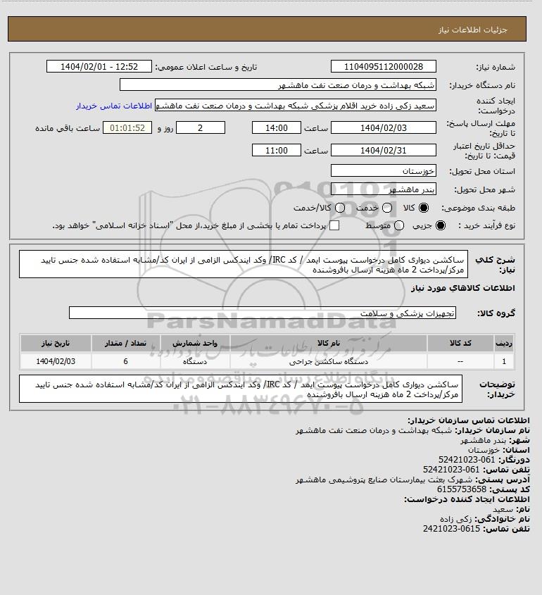 شرح کلی نیاز: ساکشن دیواری کامل درخواست پیوست ایمد / کد IRC/ وکد ایندکس الزامی از ایران کد/مشابه استفاده شده جنس تایید مرکز/پرداخت 2 ماه هزینه ارسال بافروشنده