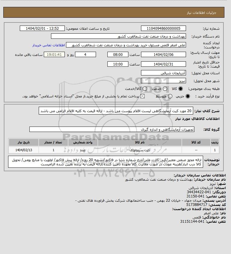 شرح کلی نیاز: 20 مورد کیت آزمایشگاهی لیست اقلام پیوست می باشد - ارائه قیمت به کلیه اقلام الزامی می باشد