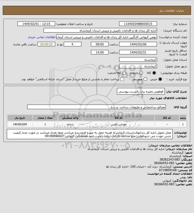 نام دستگاه خریدار:اداره کل زندان ها و اقدامات تامینی و تربیتی استان کرمانشاه