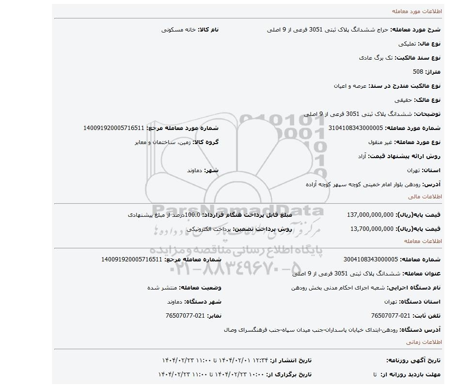 مزایده ششدانگ پلاک ثبتی 3051 فرعی از 9 اصلی, مزایده، ششدانگ پلاک ثبتی 3051 فرعی از 9 اصلی