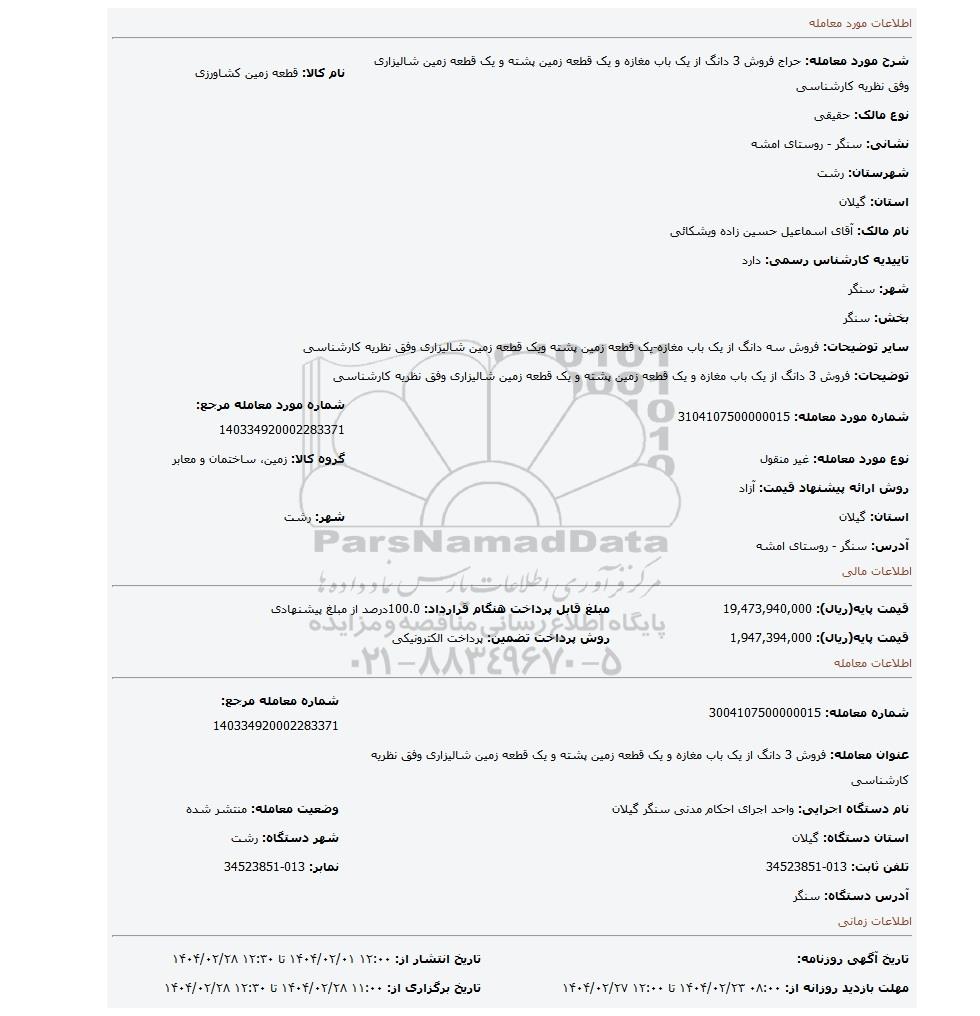 مزایده، فروش 3 دانگ از یک باب مغازه و یک قطعه زمین پشته و یک قطعه زمین شالیزاری وفق نظریه کارشناسی