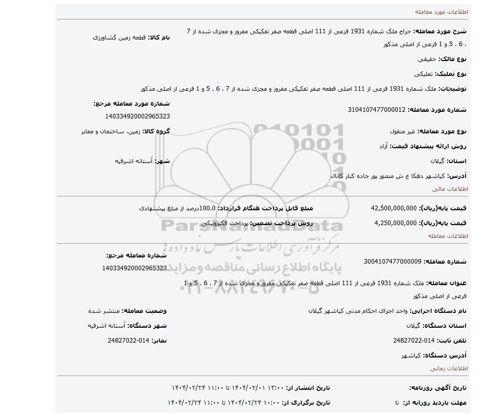 | شرح مورد معامله: حراج ملک شماره 1931 فرعی از 111 اصلی قطعه صفر تفکیکی مفروز و مجزی شده از 7 ، 6 ، 5 و 1 فرعی از اصلی مذکور | نام کالا: قطعه زمین کشاورزی | |