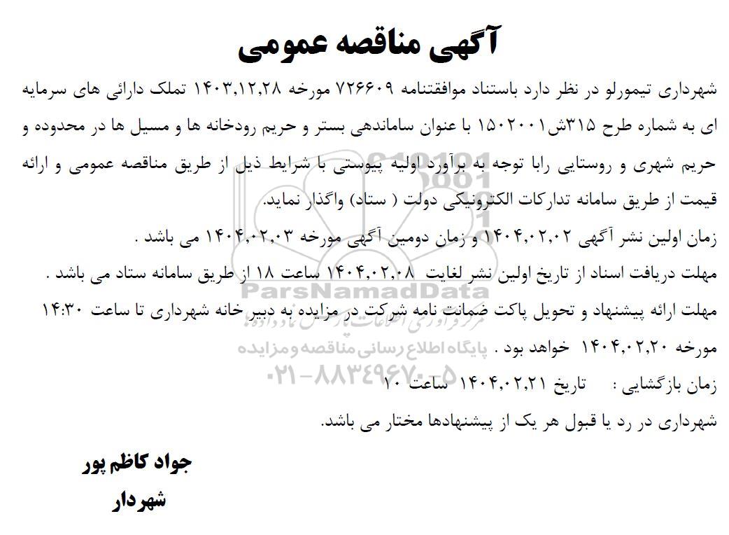 شهرداری تیمورلو در نظر دارد باستناد موافقتنامه 726609 مورخه 1403.12.28 تملک دارائی های سرمایه ای به شماره طرح 315 ش 1502001 با عنوان ساماندهی بستر و حریم رودخانه ها و مسیل ها در محدوده و حریم شهری و روستایی را با توجه به برآورد اولیه پیوستی با شرایط ذیل از طریق مناقصه عمومی و ارائه قیمت از طریق سامانه تدارکات الکترونیکی دولت (ستاد) واگذار نماید.