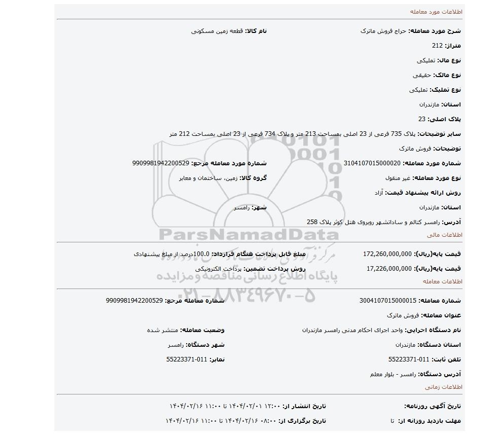 | شرح مورد معامله: حراج فروش ماترک | نام کالا: قطعه زمین مسکونی | |