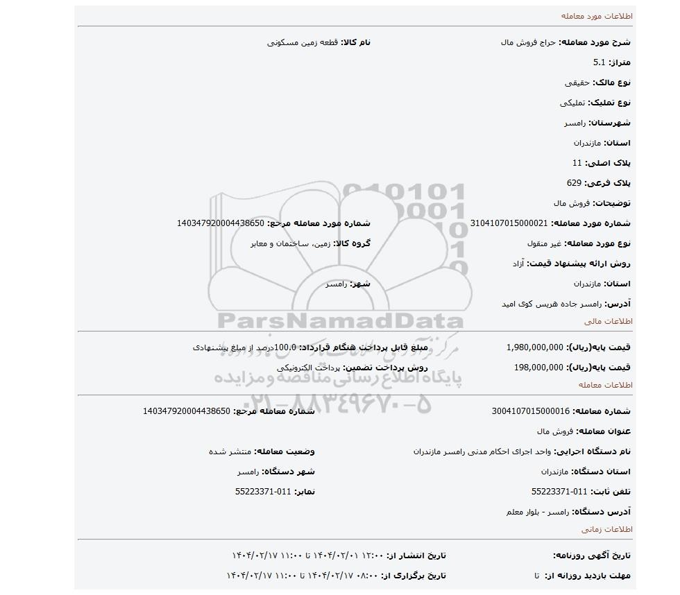 شرح مورد معامله: حراج فروش مال نام کالا: قطعه زمین مسکونی