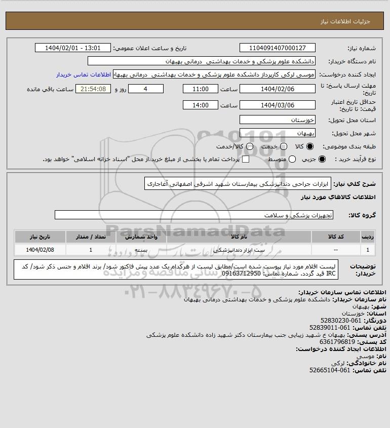 شرح کلی نیاز: ابزارات جراحی دندانپزشکی بیمارستان شهید اشرفی اصفهانی آغاجاری