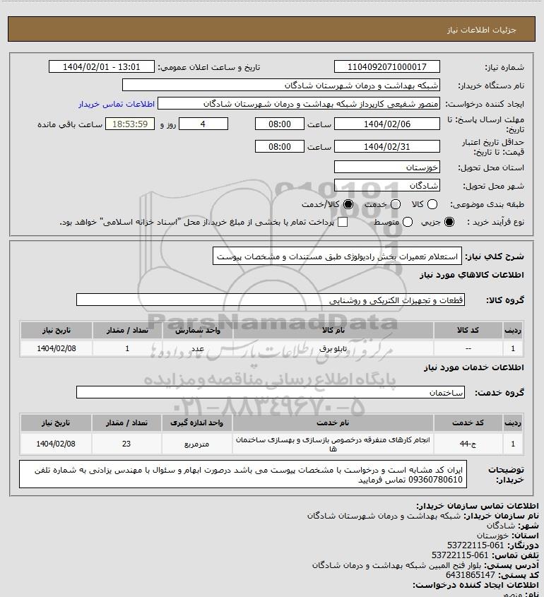 نام دستگاه خریدار:شبکه بهداشت و درمان شهرستان شادگان