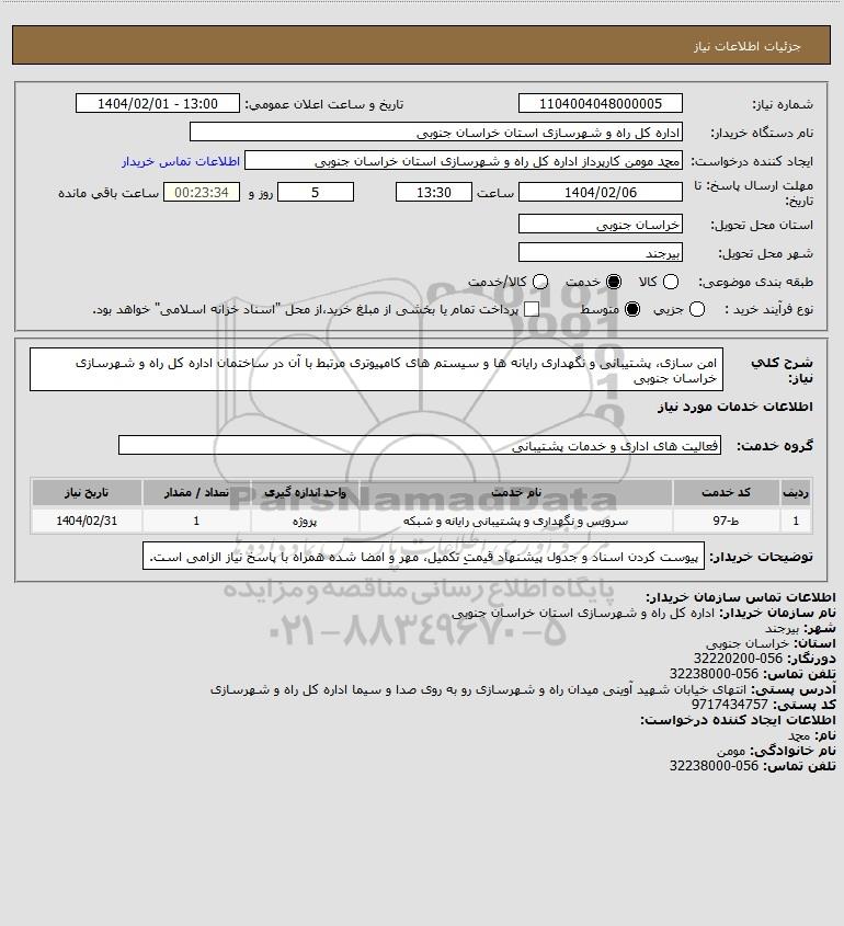 شرح کلی نیاز: امن سازی، پشتیبانی و نگهداری رایانه ها و سیستم های کامپیوتری مرتبط با آن در ساختمان اداره کل راه و شهرسازی خراسان جنوبی