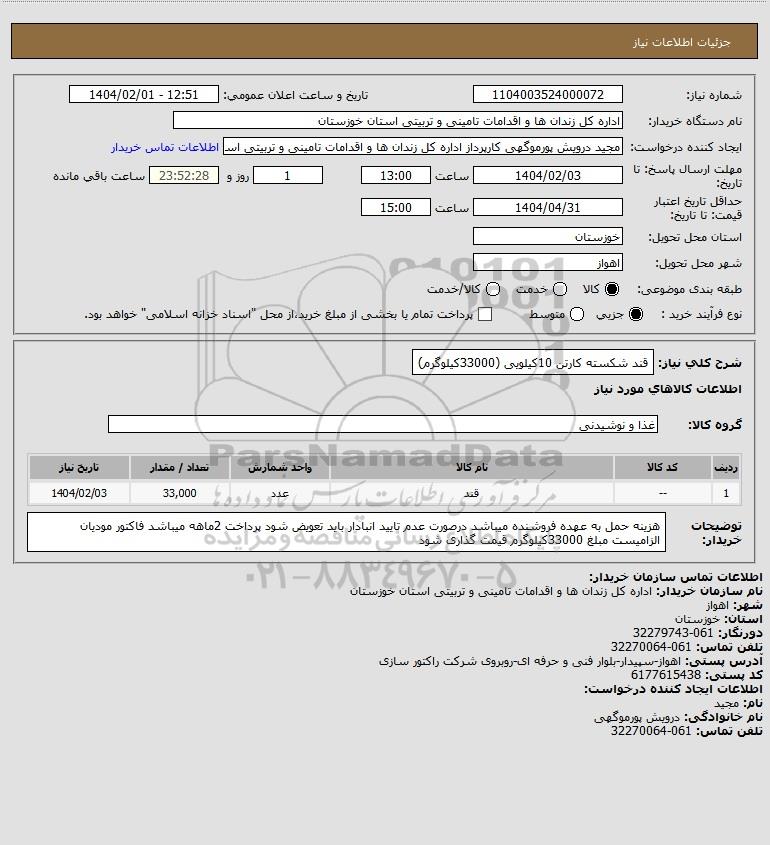 استعلام قند شکسته کارتن 10کیلویی (33000کیلوگرم), استعلام قند شکسته کارتن 10کیلویی (33000کیلوگرم)
