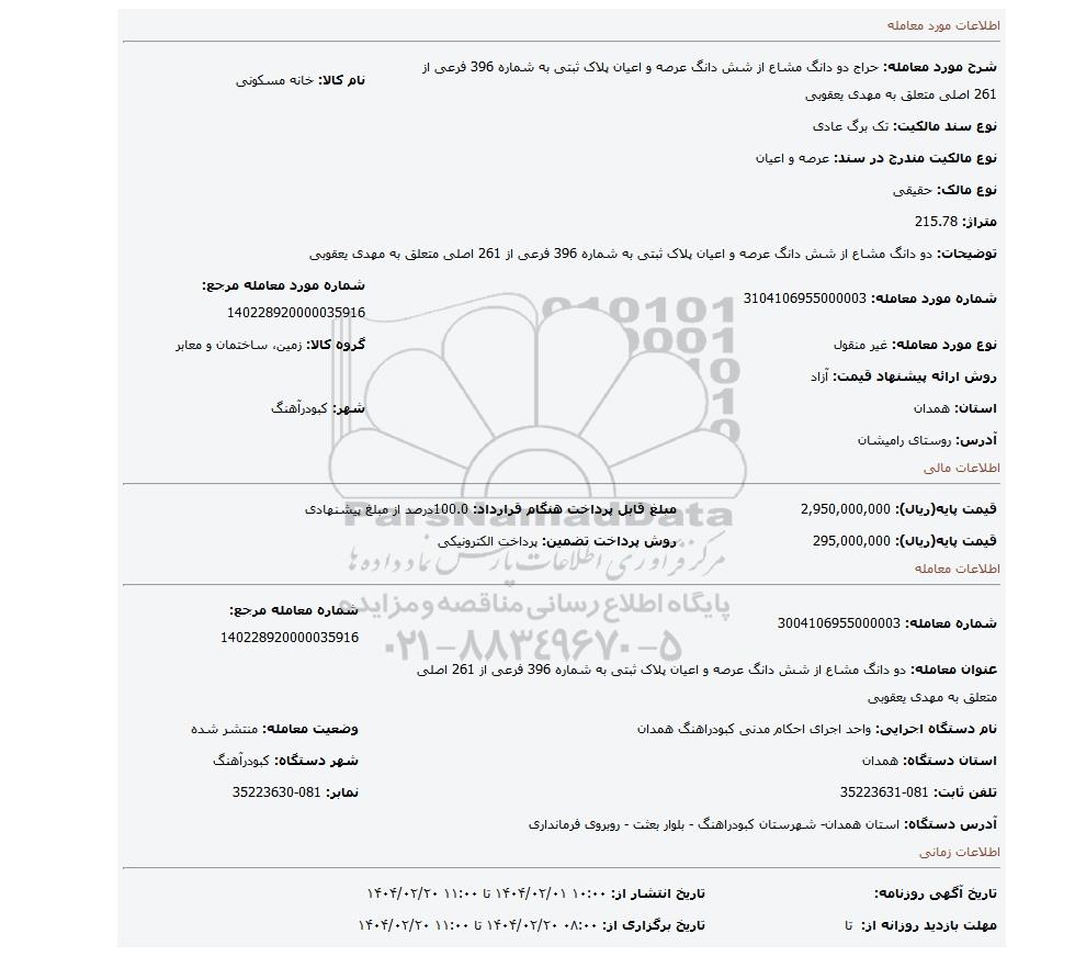 | عنوان معامله: دو دانگ مشاع از شش دانگ عرصه و اعیان پلاک ثبتی به شماره 396 فرعی از 261 اصلی متعلق به مهدی یعقوبی | ||