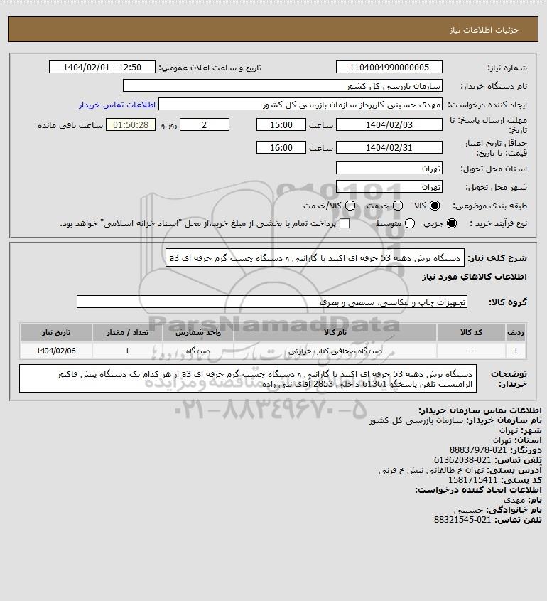 توضیحات خریدار:دستگاه برش دهنه 53 حرفه ای اکبند با گارانتی و دستگاه چسب گرم حرفه ای a3 از هر کدام یک دستگاه پیش فاکتور الزامیست تلفن پاسخگو 61361 داخلی 2853 آقای نبی زاده