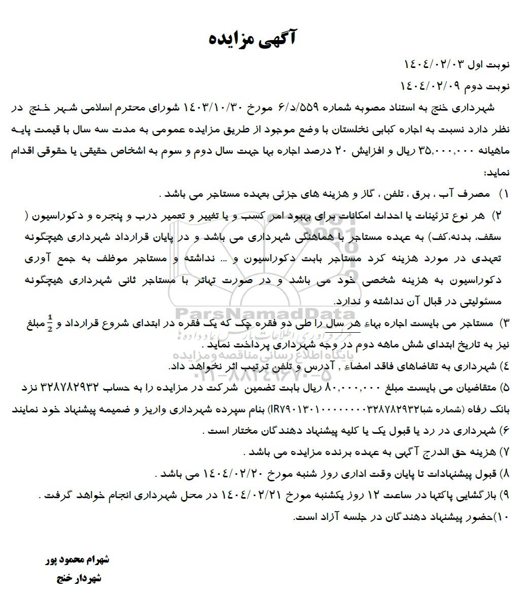 شهرداری خنج به استناد مصوبه شماره 559/ د / 6 مورخ 1403.10.30 شورای محترم اسلامی شهر خلج در نظر دارد نسبت به اجاره کبابی نخلستان با وضع نظر دارد نسبت به اجاره کبابی نخلستان با وضع موجود از طریق مزایده عمومی به مدت سه سال با قیمت پایه ماهیانه 35.000.000 ریال و افزایش 20 درصد اجاره بها جهت سال دوم و سوم به اشخاص حقیقی یا حقوقی اقدام نماید