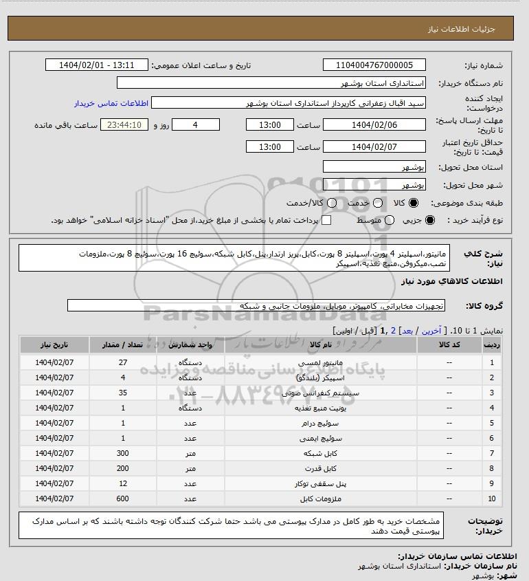 شرح کلی نیاز: مانیتور،اسپلیتر 4 پورت،اسپلیتر 8 پورت،کابل،پریز ارتدار،پنل،کابل شبکه،سوئیچ 16 پورت،سوئیچ 8 پورت،ملزومات نصب،میکروفن،منبع تغذیه،اسپیکر