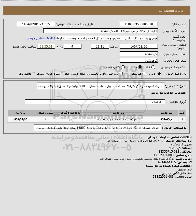 شرح کلی نیاز: اجرای تعمیرات و دیگر کارهای مساجد سرپل ذهاب با مبلغ 14800 میلون ریال طبق فایلهای پیوست