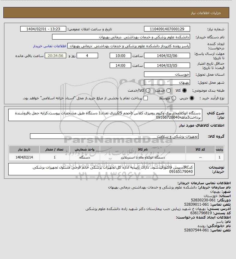 استعلام دستگاه اتوکلاوبخار پری وکیوم رومیزی کلاس bحجم 25لیتری تعداد1 دستگاه طبق مشخصات پیوست.کرایه حمل بافروشنده پرداخت3ماهه09166720040, استعلام دستگاه اتوکلاوبخار پری وکیوم رومیزی کلاس bحجم 25لیتری تعداد1 دستگاه طبق مشخصات پیوست.کرایه حمل بافروشنده پرداخت3ماهه09166720040