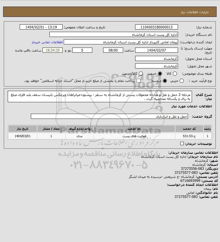 شرح کلی نیاز: مرحله 2 حمل و نقل و مبادله محمولات پستی از کرمانشاه به سنقر - بیستون-میانراهان وبرعکس بانیسان سقف بلند فلزی مبلغ به ریال و یکساله محاسبه گردد .