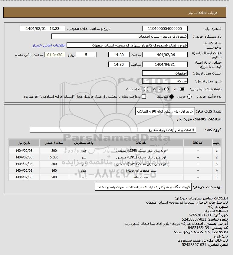 شرح کلی نیاز: خرید لوله پلی اتیلن 63و 90 و اتصالات