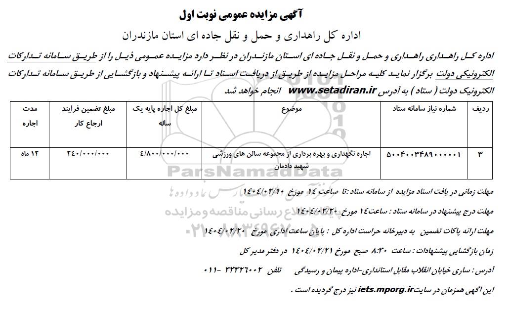 اداره کل راهداری راهداری و حمل و نقل جاده ای استان مازندران در نظر دارد مزایده عمومی ذیل را از طریق سامانه تدارکات الکترونیکی دولت برگزار نماید کلیه مراحل مزایده از طریق از دریافت اسناد تا ارائه پیشنهاد و بازگشایی از طریق سامانه تدارکات الکترونیک دولت ) ستاد ) به آدرس سایت ستاد ایران انجام خواهد شد