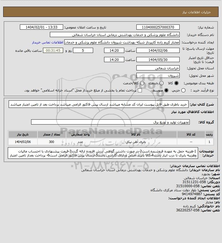 استعلام خرید باطری طبق فایل پیوست ایران کد مشابه میباشد ارسال پیش فاکتور الزامی میباشد پرداخت بعد از تامین اعتبار میباشد, استعلام خرید باطری طبق فایل پیوست ایران کد مشابه میباشد ارسال پیش فاکتور الزامی میباشد پرداخت بعد از تامین اعتبار میباشد