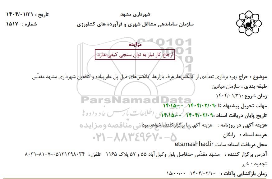 موضوع : حراج بهره برداری تعدادی از کانکسها غرف بازارها کانکسهای ذیل پل عابر پیاده و کافه ون شهرداری مشهد مقدس