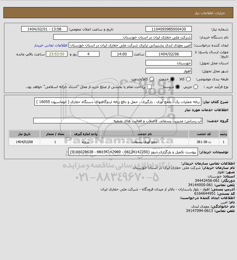 شرح کلی نیاز: زباله عملیات یک - جمع آوری ، بارگیری ، حمل و دفع زباله اردوگاههای دستگاه حفاری ( اتوماسیون 16055 )