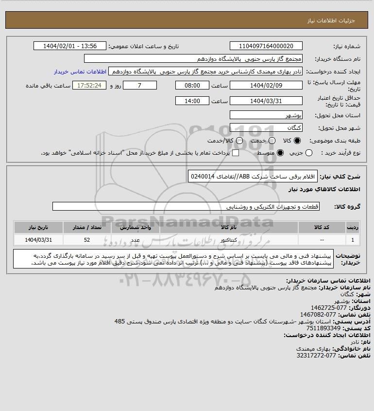 استعلام اقلام برقی ساخت شرکت ABB//تقاضای 0240014, استعلام اقلام برقی ساخت شرکت ABB//تقاضای 0240014
