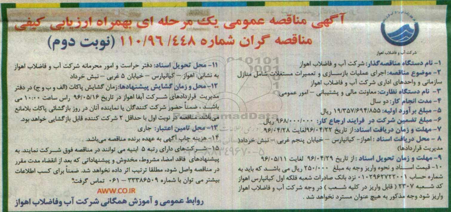 2- موضوع مناقصه: اجرای عملیات بازسازی و تعمیرات مستغلات شامل منازل سازمانی و واحدهای اداری شرکت آب و فاضلاب اهواز