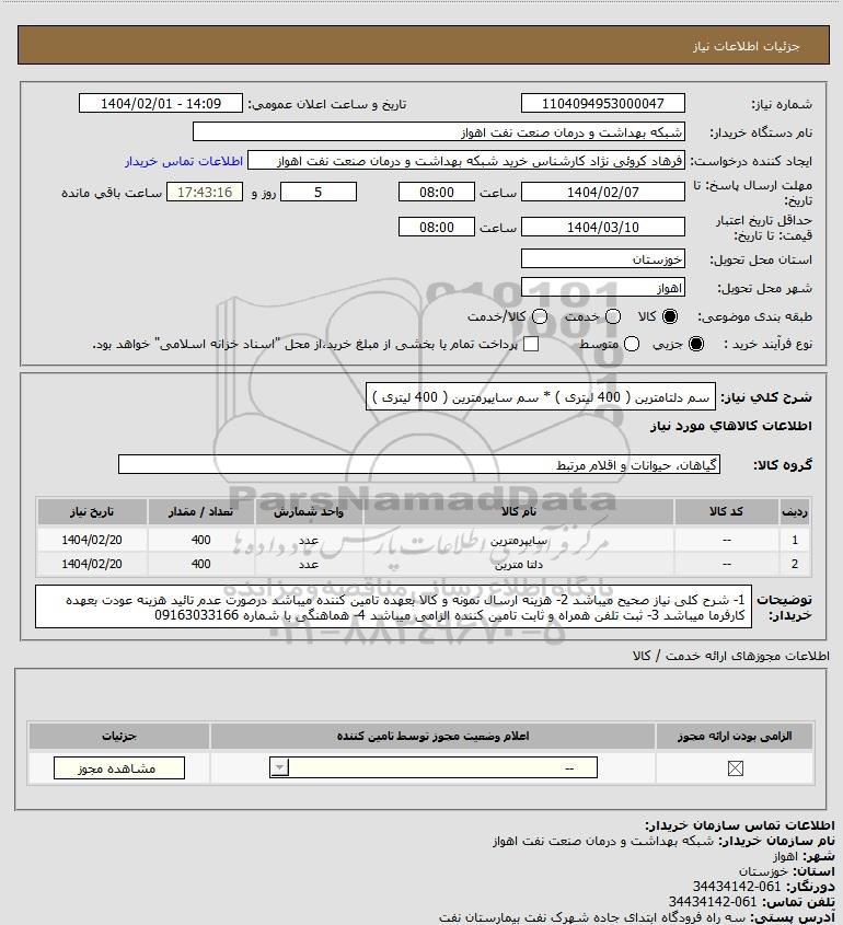 شرح کلی نیاز: سم دلتامترین ( 400 لیتری ) * سم سایپرمترین ( 400 لیتری )