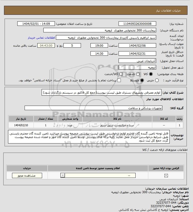 شرح کلی نیاز: لوازم مصرفی بخشهای بستری طبق لیست پیوست(جمع کل فاکتور در سیستم بارگذاری شود)