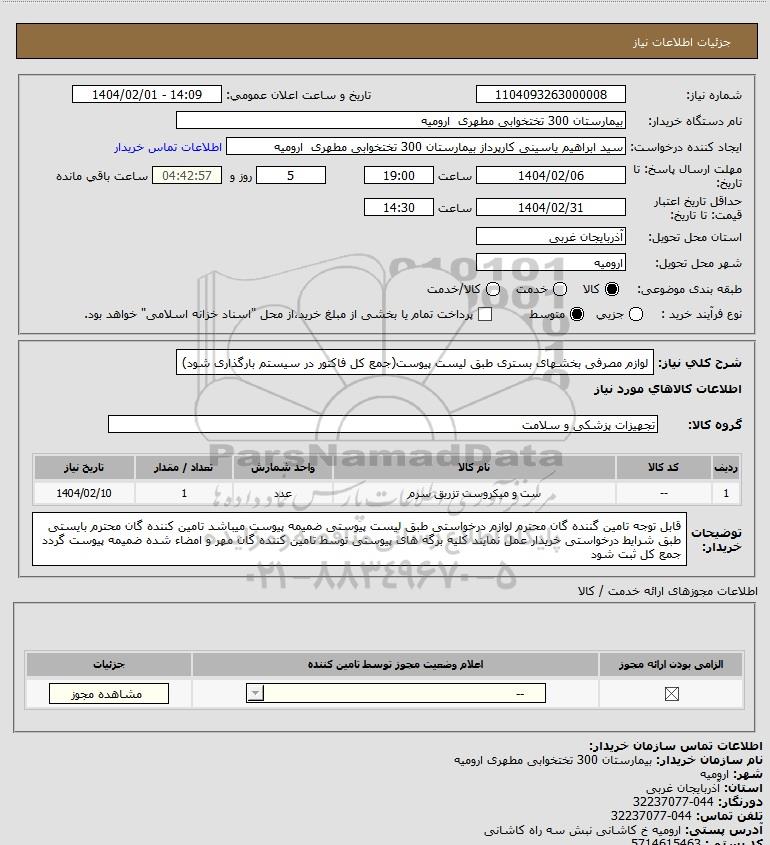 شرح کلی نیاز: لوازم مصرفی بخشهای بستری طبق لیست پیوست(جمع کل فاکتور در سیستم بارگذاری شود)