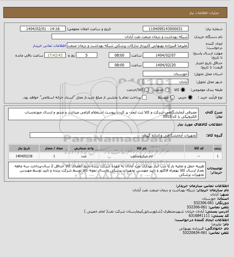 شرح کلی نیاز: مصرفی آزمایشگاهی-شرکت و کالا ثبت ایمد- پر کردن پیوست استعلام الزامی میباشد و صدور و ارسال صورتحساب الکترونیکی با کد 0015