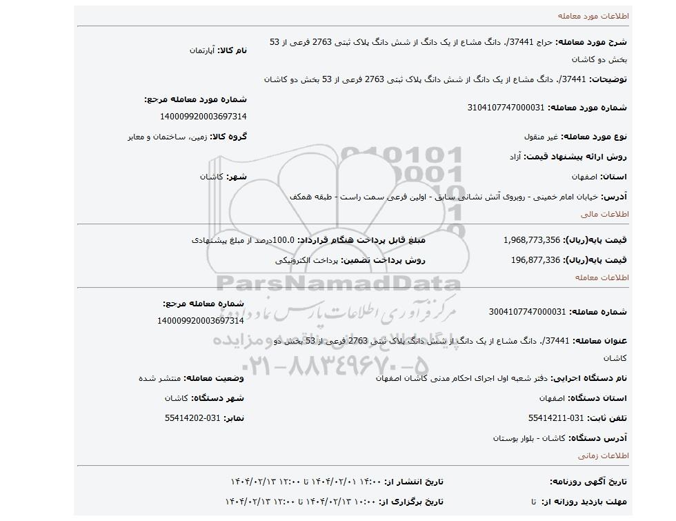 | شرح مورد معامله: حراج 37441/. دانگ مشاع از یک دانگ از شش دانگ پلاک ثبتی 2763 فرعی از 53 بخش دو کاشان | نام کالا: آپارتمان | |