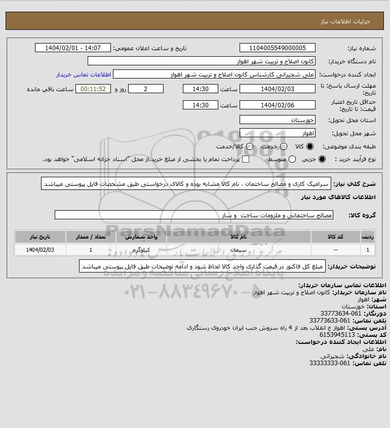شرح کلی نیاز: سرامیک کاری و مصالح ساختمان ، نام کالا مشابه بوده و کالای درخواستی طبق مشخصات فایل پیوستی میباشد