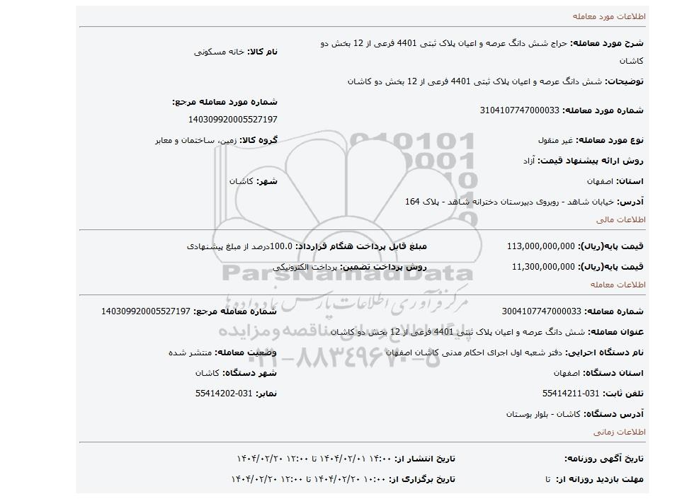 | شرح مورد معامله: حراج شش دانگ عرصه و اعیان پلاک ثبتی 4401 فرعی از 12 بخش دو کاشان | نام کالا: خانه مسکونی | |