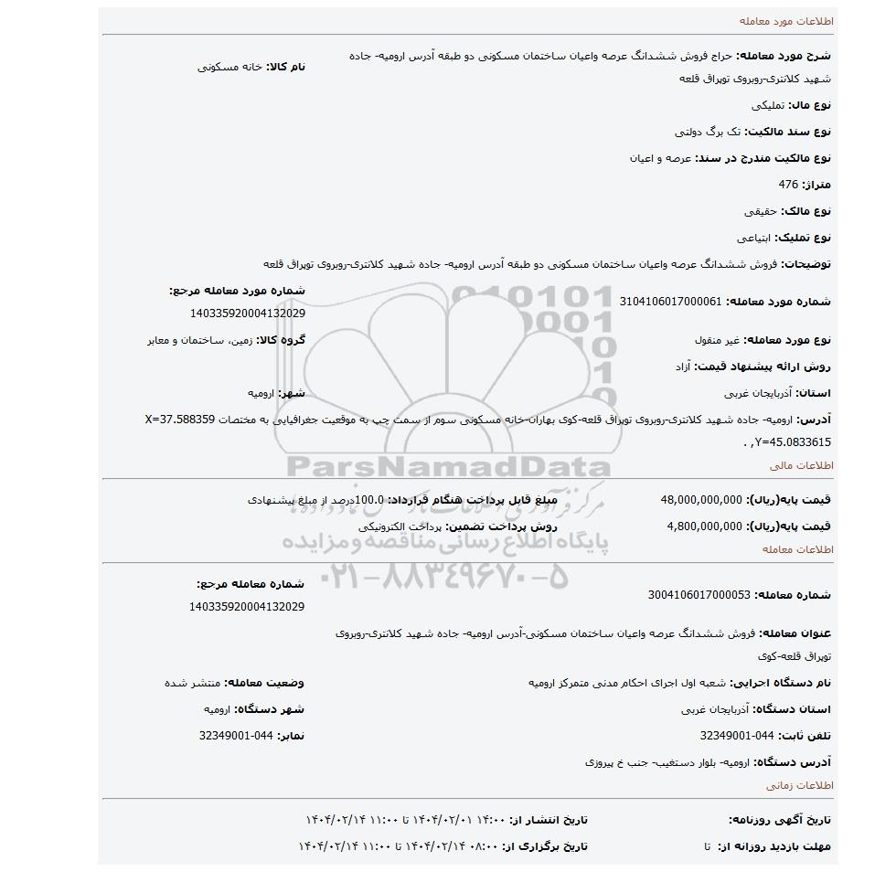 | شرح مورد معامله: حراج فروش ششدانگ عرصه واعیان ساختمان مسکونی دو طبقه آدرس ارومیه- جاده شهید کلانتری-روبروی توپراق قلعه | نام کالا: خانه مسکونی | |