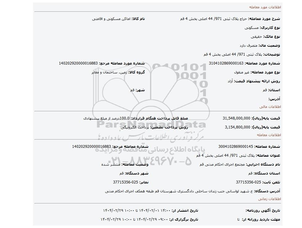 | شرح مورد معامله: حراج پلاک ثبتی 971/ 44 اصلی بخش 4 قم | نام کالا: اماکن مسکونی و اقامتی | |