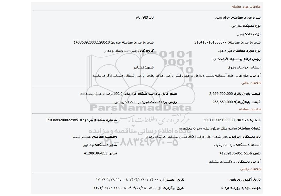 | شماره مورد معامله: 3104107161000077 | شماره مورد معامله مرجع: 140368920002298510 | |