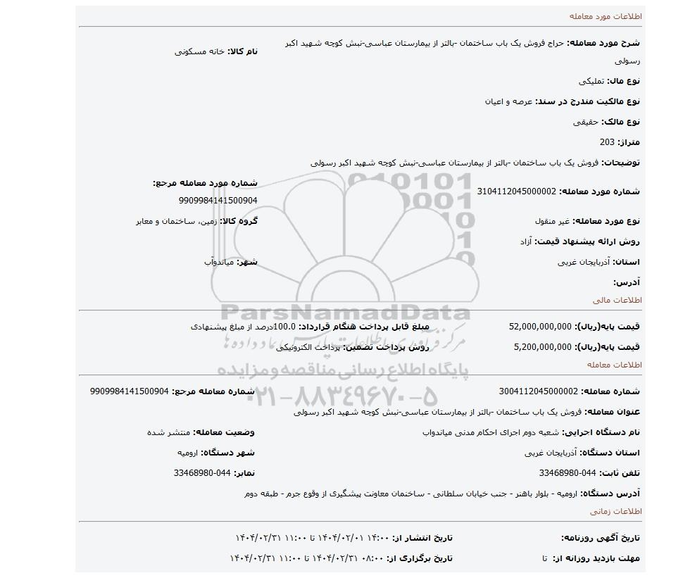 | شماره مورد معامله: 3104112045000002 | شماره مورد معامله مرجع: 9909984141500904 | |