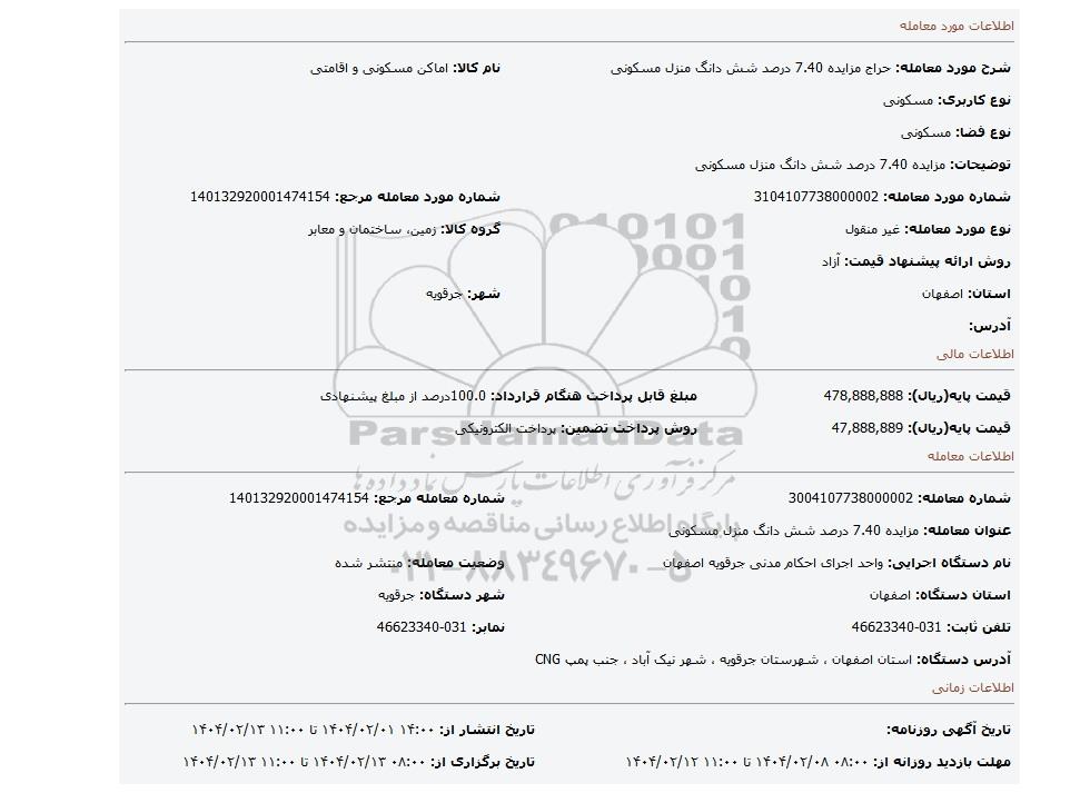 | شرح مورد معامله: حراج مزایده 7.40 درصد شش دانگ منزل مسکونی | نام کالا: اماکن مسکونی و اقامتی | |